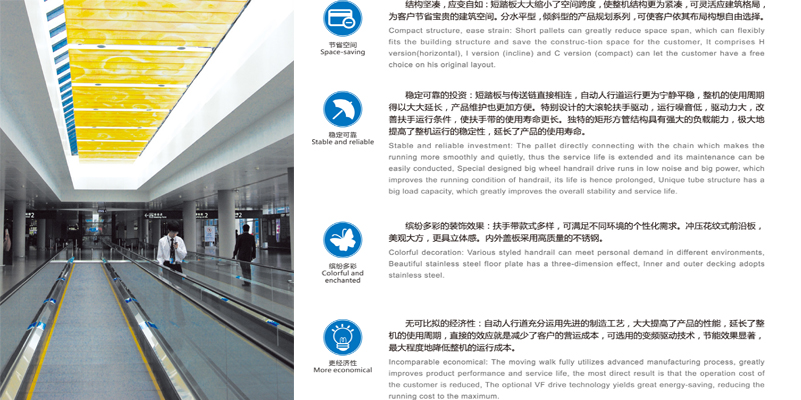 梅輪自動人行道將購物、乘機帶入簡約舒適的新境界。不僅能滿足人流量巨大的輸送問題,又能滿足長距離步行和運送行李車、嬰兒車、購物車、殘疾車等要求,大大方便了人們的出行與購物。