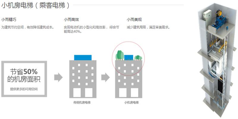 機房空間僅僅是電梯井道的一個延伸,因此建造方便,能耗成本低。緊湊的永磁同步無齒輪主機可以為機房留出更大的空間,放置其他控制設備。